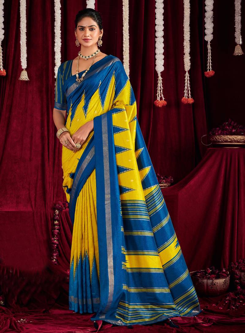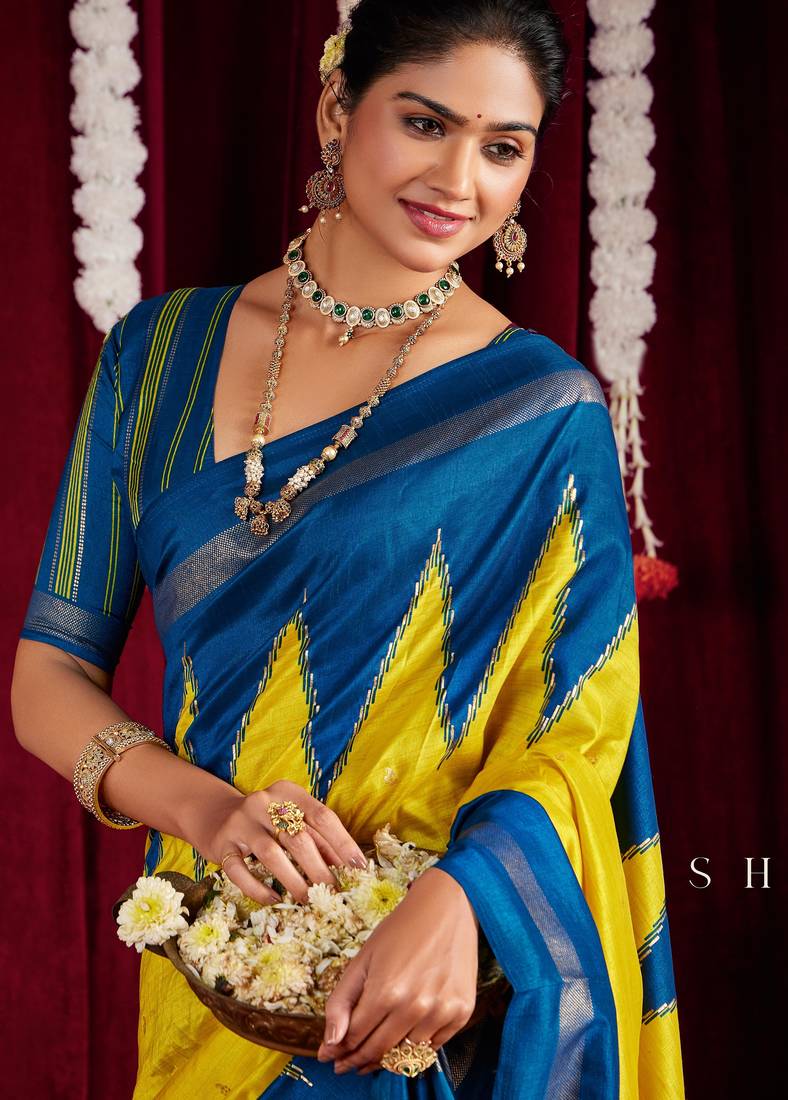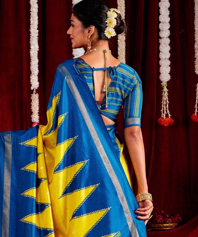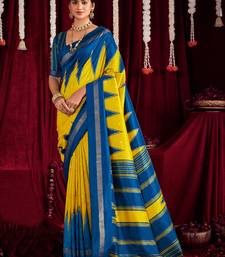 Yellow & blue color ikkat art silk fabric designer zig zag printed traditional party looks saree