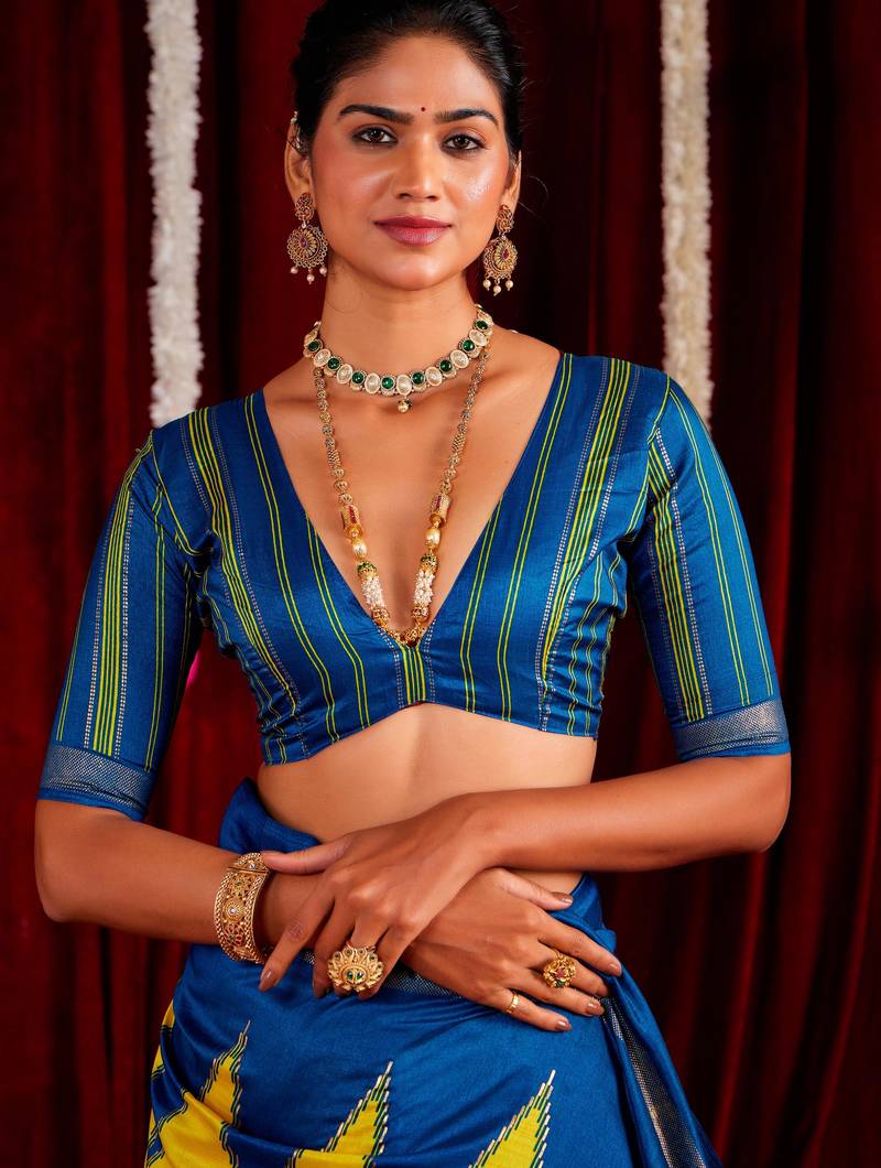 | Product Name | Yellow & Blue Color Ikkat Art Silk Fabric Designer Zig Zag Printed Traditional Party Looks Saree | |
