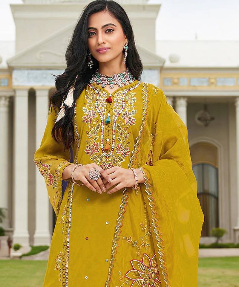 Yellow color beautiful ethnic partywear designer embroidered suit unstitched