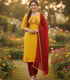 Yellow color cotton slub fabric designer casual suit with embroidery unstitched