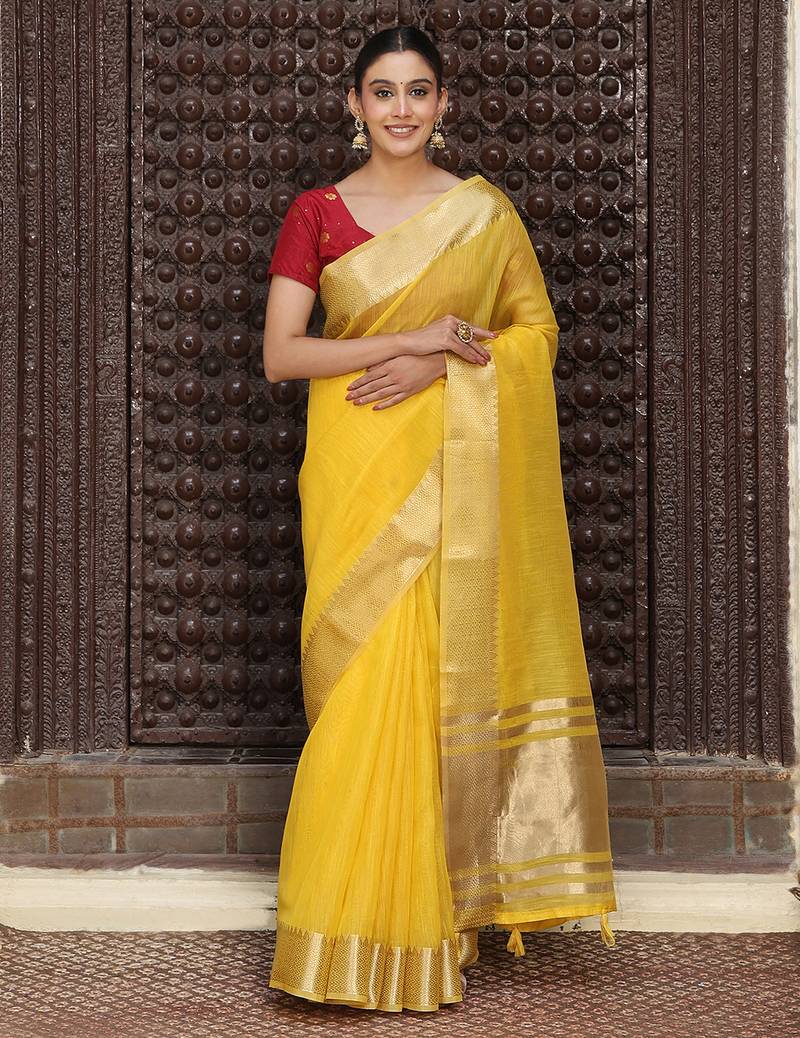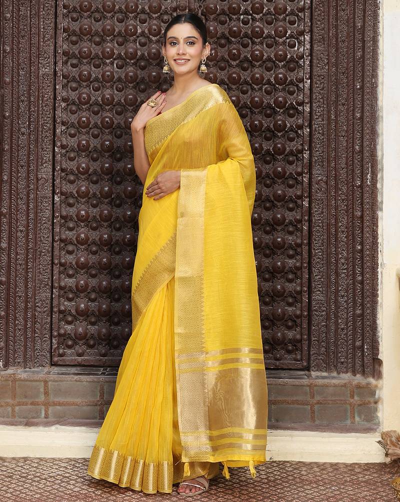 Yellow color rich ethnic cotton based saree with rich woven designer looks