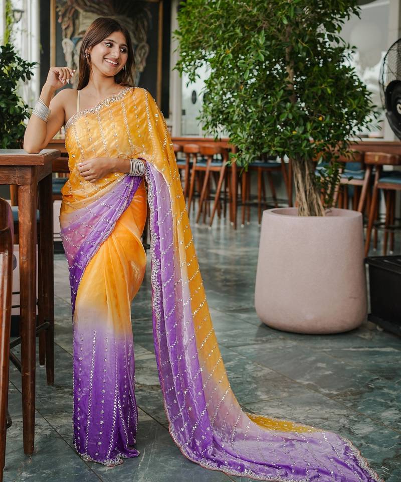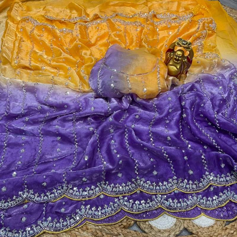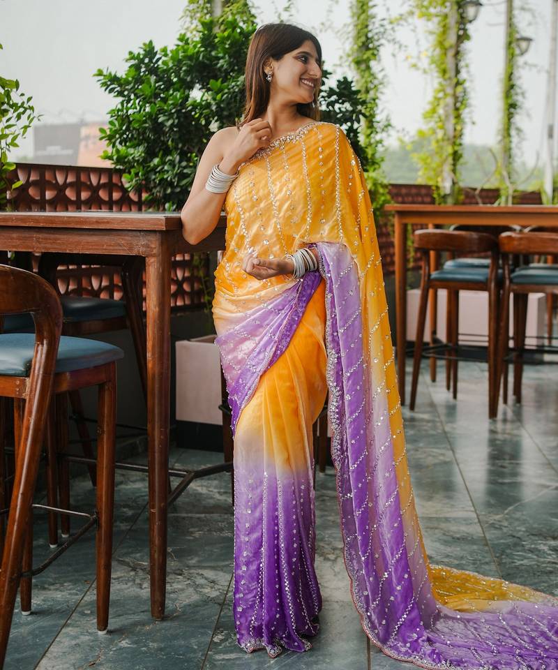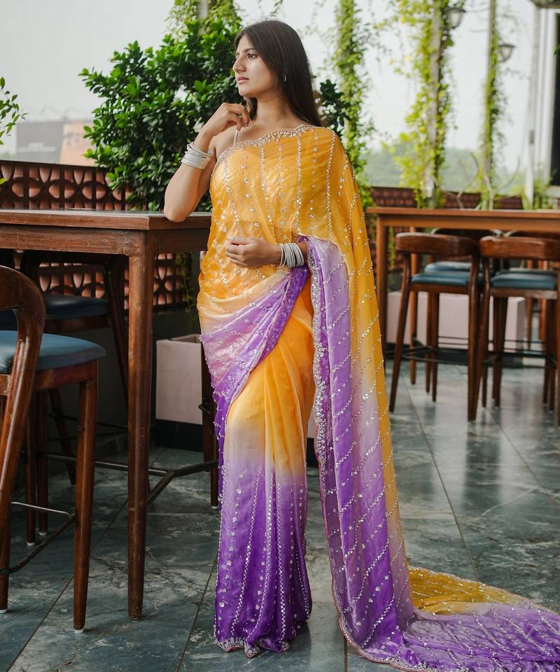 | Product Name | Yellow Color Trendy Fendy Satin Fabric Pedding With Beads Hand Work Saree | |