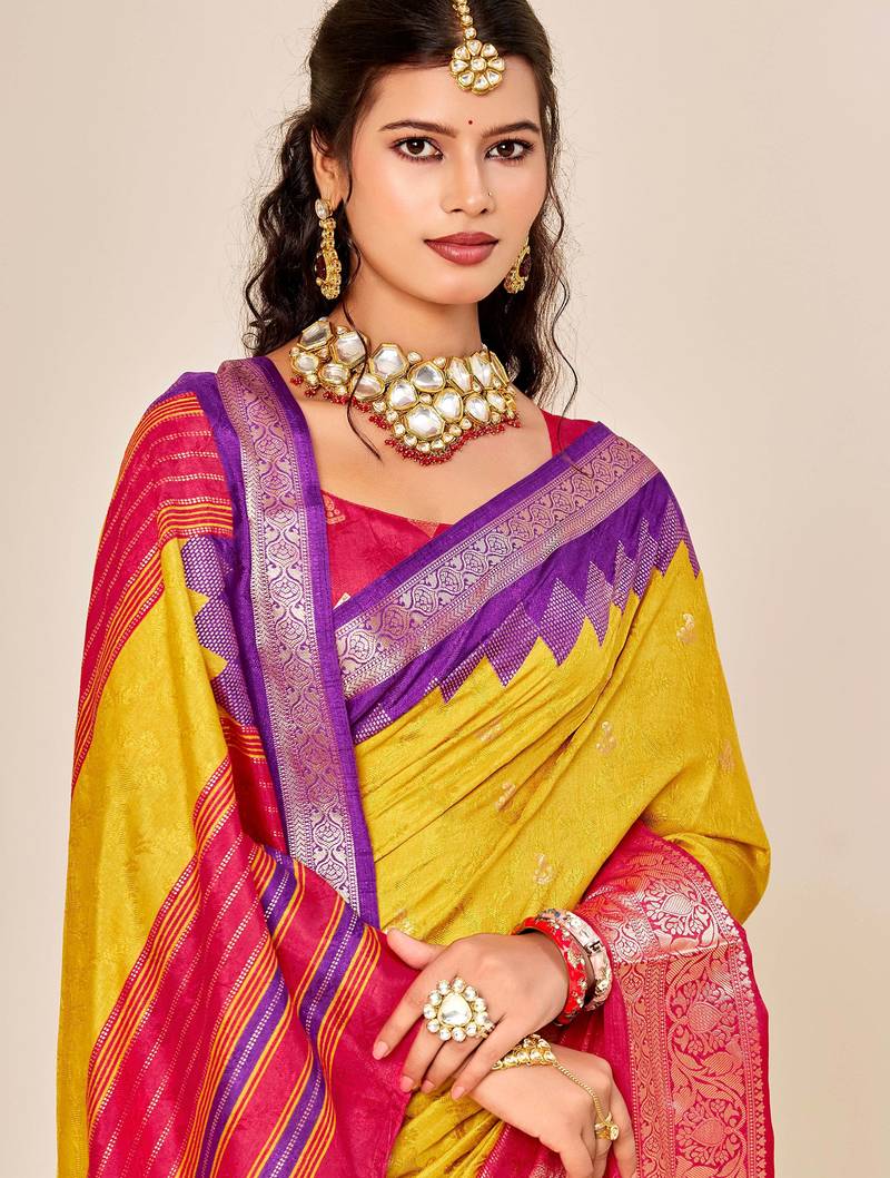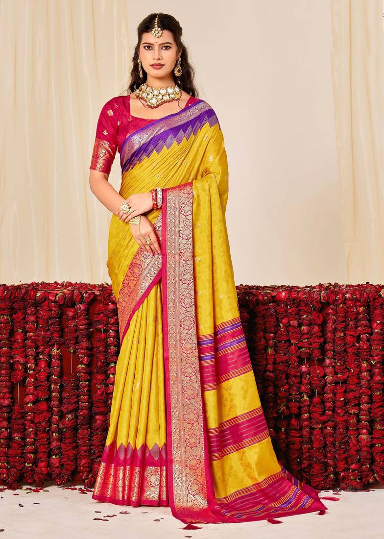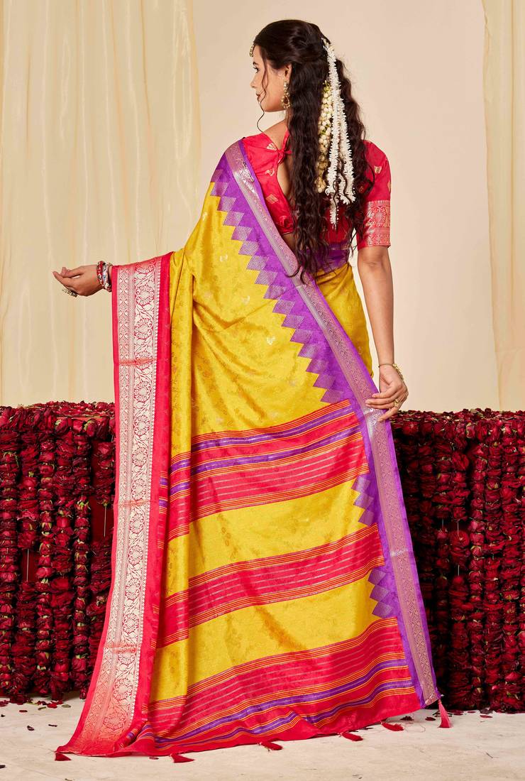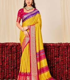 Yellow color velvet tussar silk blend fabric woven saree with smart elegant print