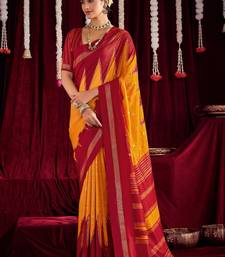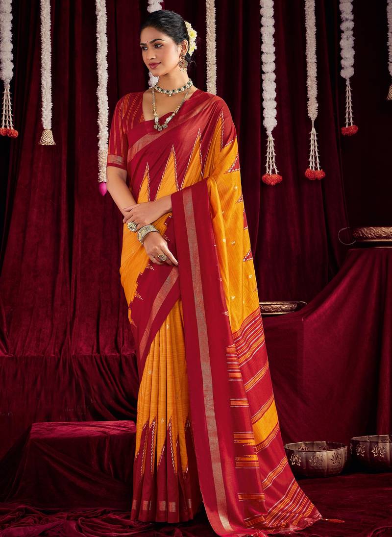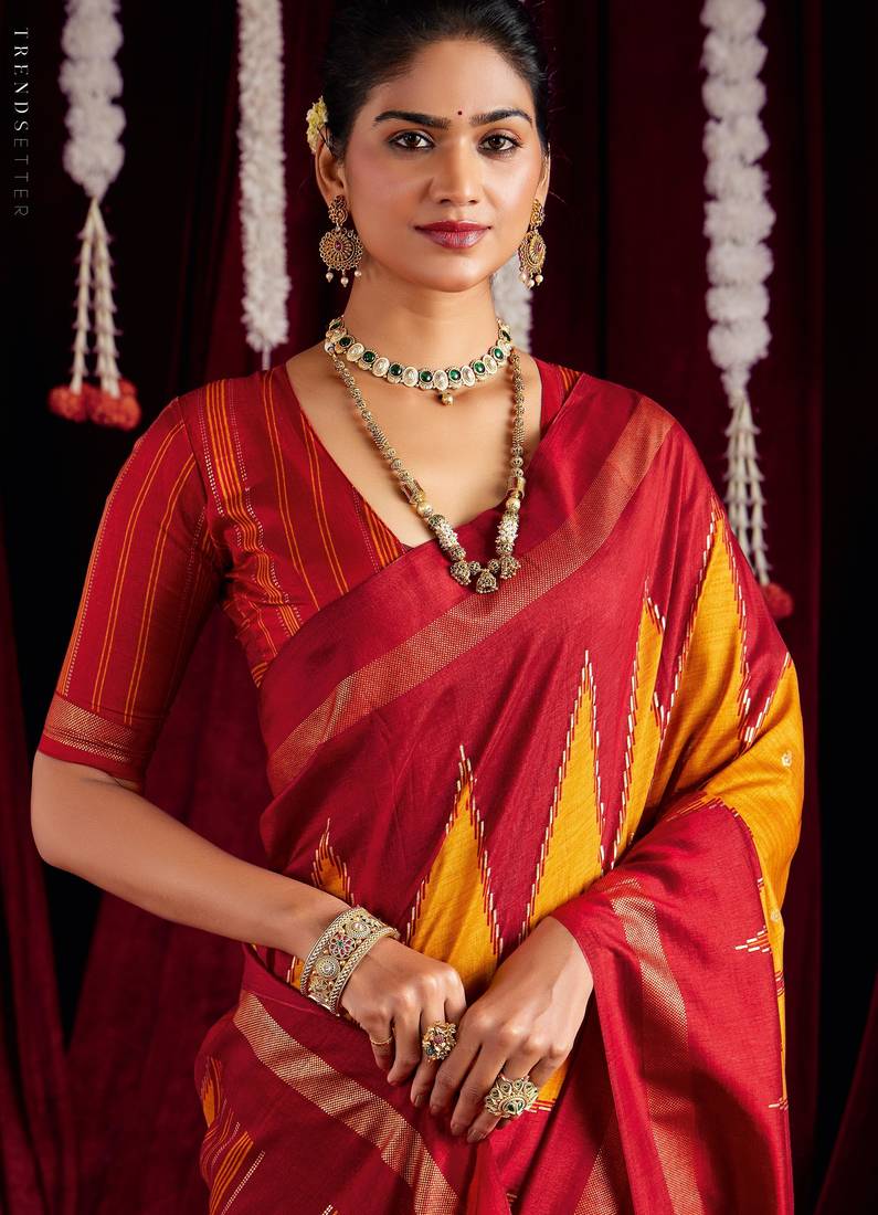 Yellow & red color ikkat art silk fabric designer zig zag printed traditional party looks saree