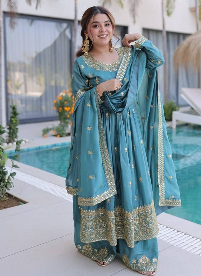| Product Name | Sky Blue Sequins Embroidered Work Stitched Kurti Sharara With Dupatta Set | |