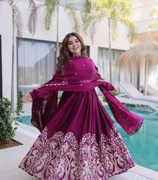 Wine sequins & embroidered work silk blend stitched kurta gown & dupatta
