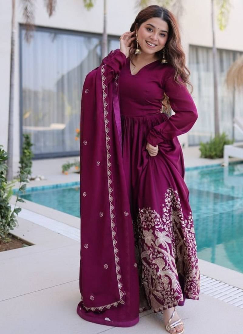 | Product Name | Wine Sequins & Embroidered Work Silk Blend Stitched Kurta Gown & Dupatta | |