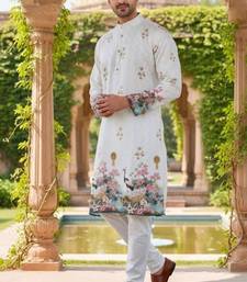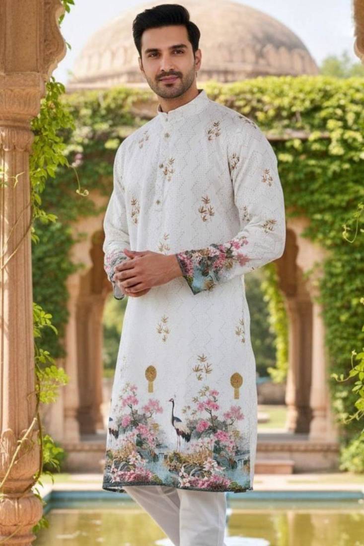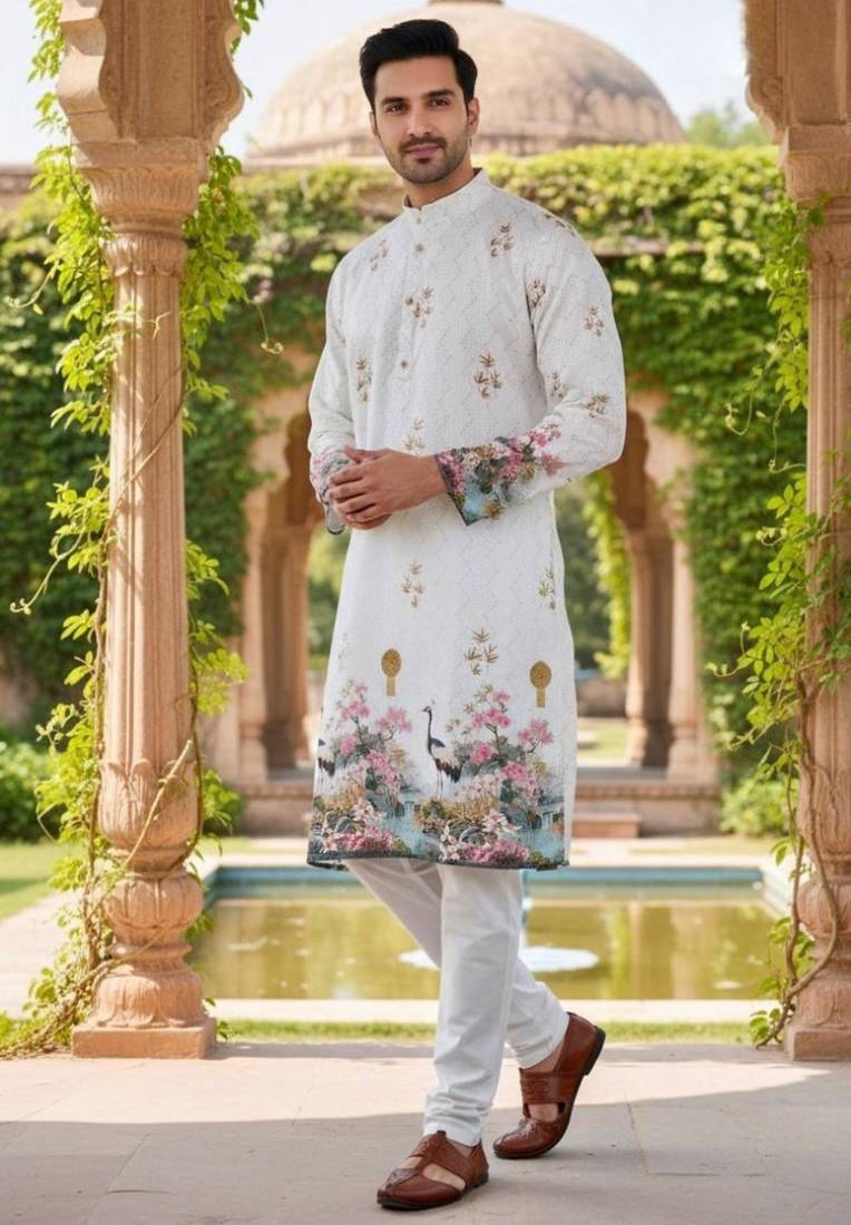 | Product Description | Sophisticated White Rayon Kurta Beautifully Detailed With Floral Embroidery And Scenic Motifs, Made From Premium Heavy Rayon Fabric For A Rich And Elegant Finish, Teamed With A White Cotton Pajama For A Perfect Ethnic Look, Best For Weddings, Festive Ceremonies, And Elegant Cultural Functions. |