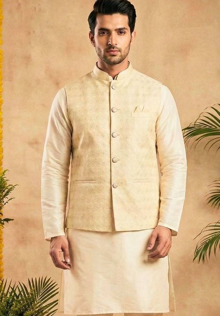 | Product Name | Men's Dhupian Silk Cream Kurta With Heavy Jacquard Koti & Silk Pyjama | |