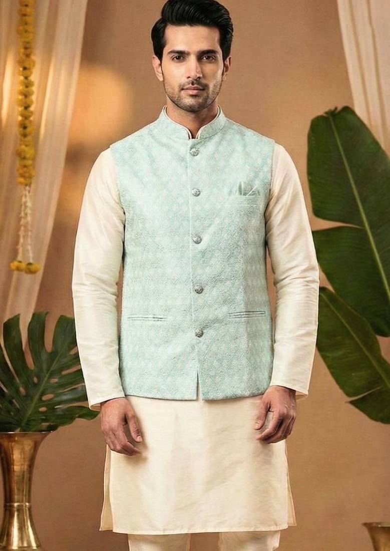 | Product Description | A Stylish Cream Mint Dhupian Silk Kurta Set With Heavy Jacquard Koti And Silk Pyjama For Elegant Celebrations |