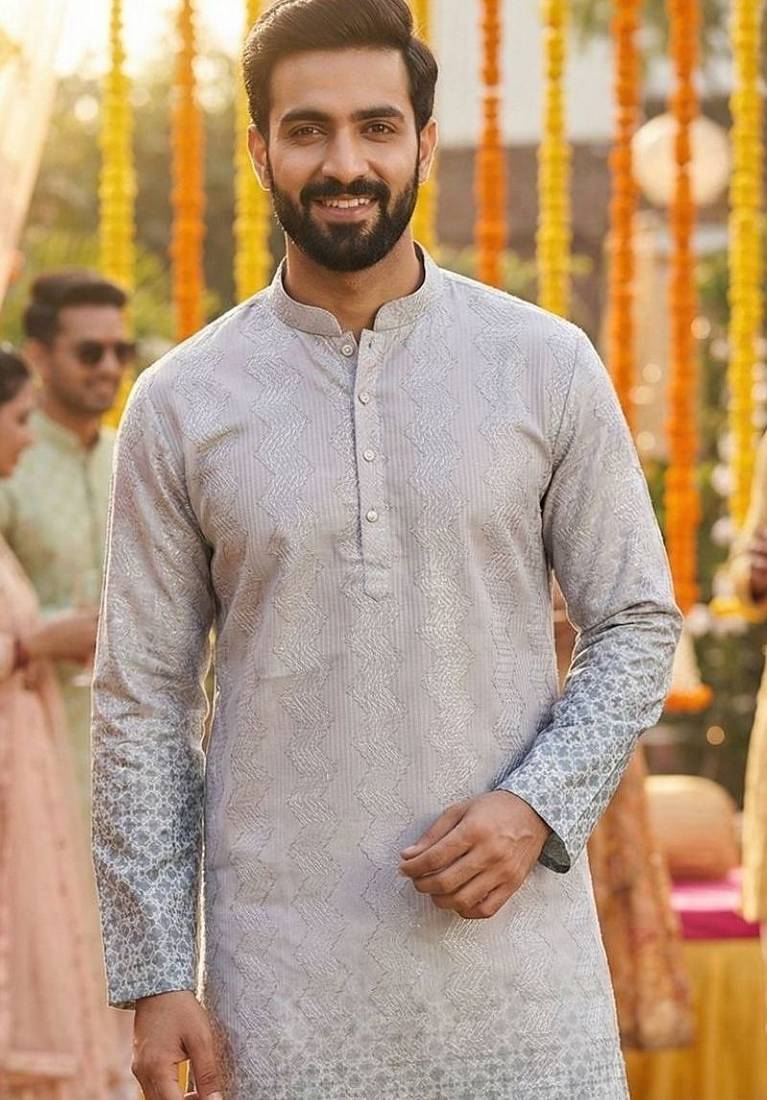 | Product Description | An Elegant Grey Heavy Rayon Kurta With Fine Embroidery, Paired With A Soft Cotton Pyjama For Festive And Traditional Wear. |