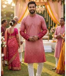 Men s heavy rayon pink embroidered kurta with cotton pyjama