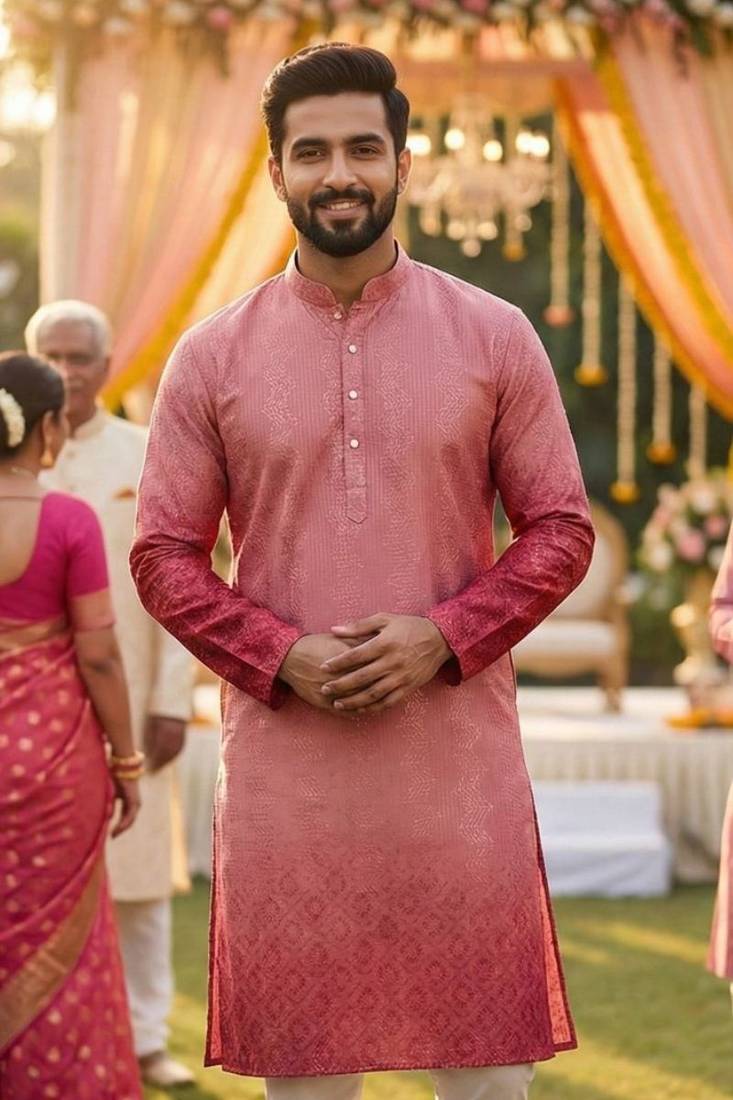 | Product Description | A Stylish Pink Heavy Rayon Kurta With Refined Embroidery, Paired With A Cotton Pyjama For Weddings And Celebrations. |