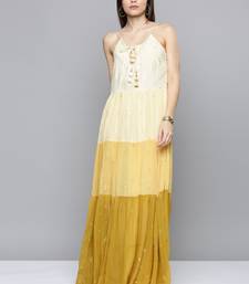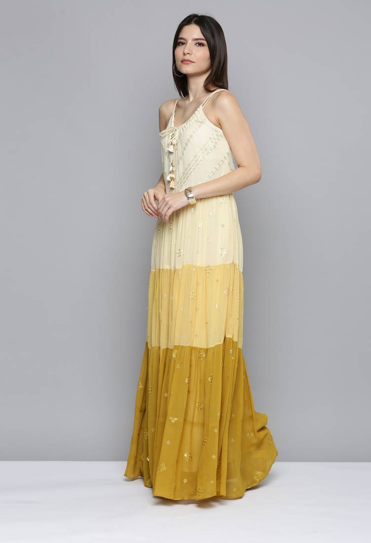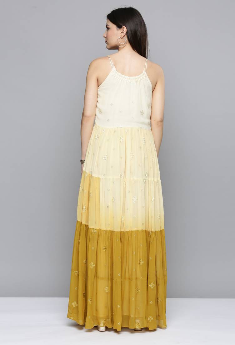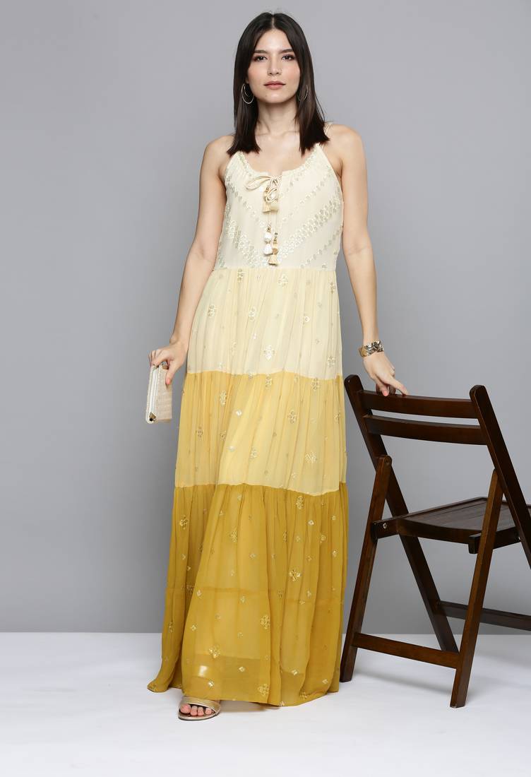 | Product Description | Kvsfab Women Mustard & Cream Embroidered Georgette Flared Kurta |
