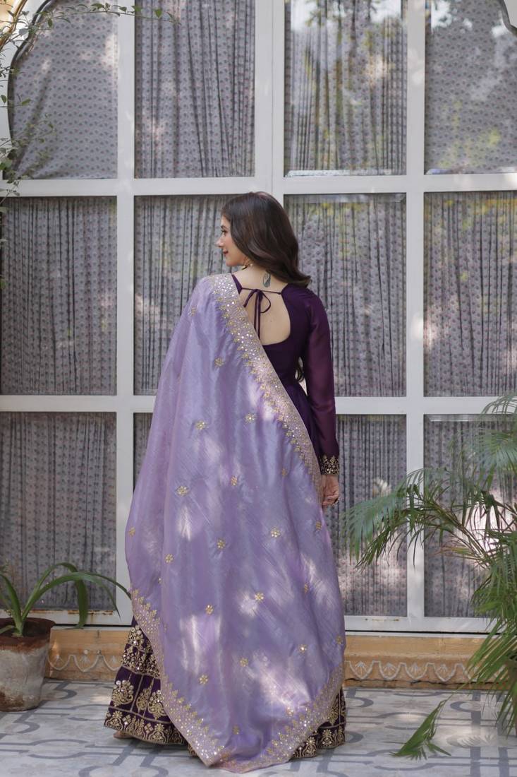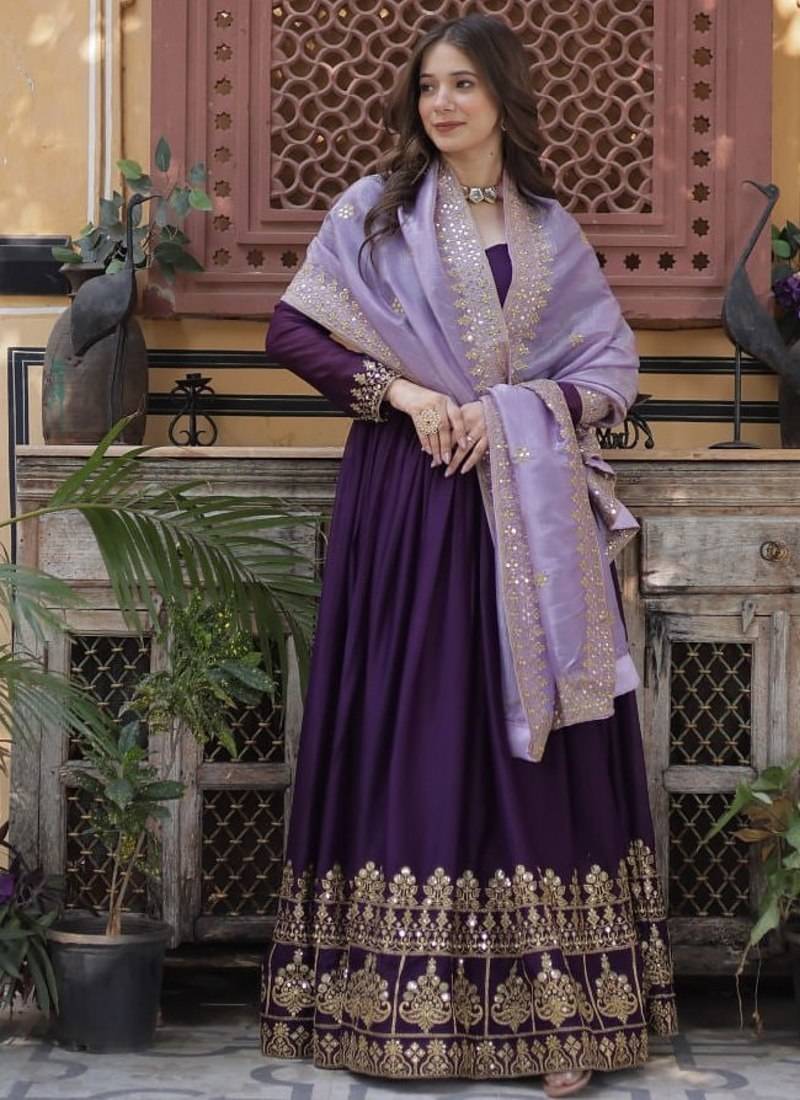 Product Description | Elegant Purple Georgette Anarkali Suit Featuring Sequin And Zari Embroidery, Paired With A Matching Dupatta—Perfect For Festive And Special Occasions. |