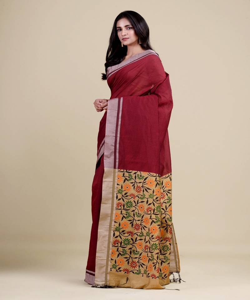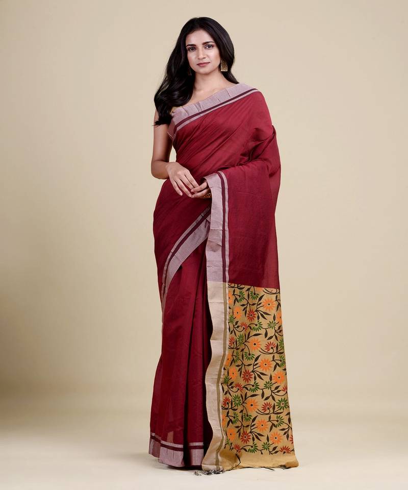 | • | Saree | : | Color- Maroon / Fabric- Cotton Silk |