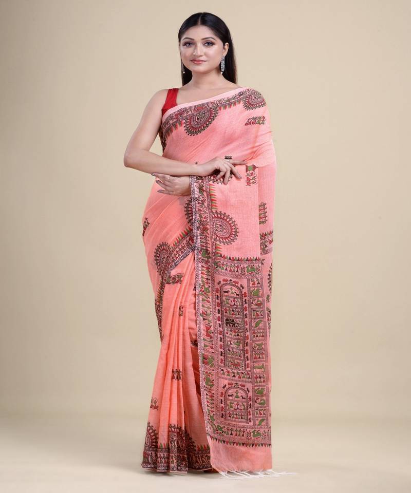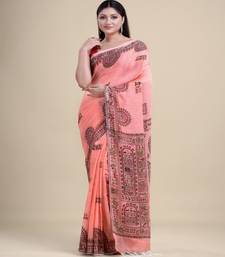 Peach & multi handloom hand woven tant jamdani saree