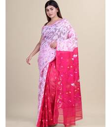 White & deep pink cotton silk hand woven jamdani handloom saree