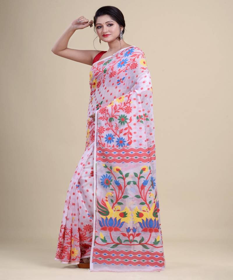 White & red dhakai jamdani hand woven cotton silk handloom saree.