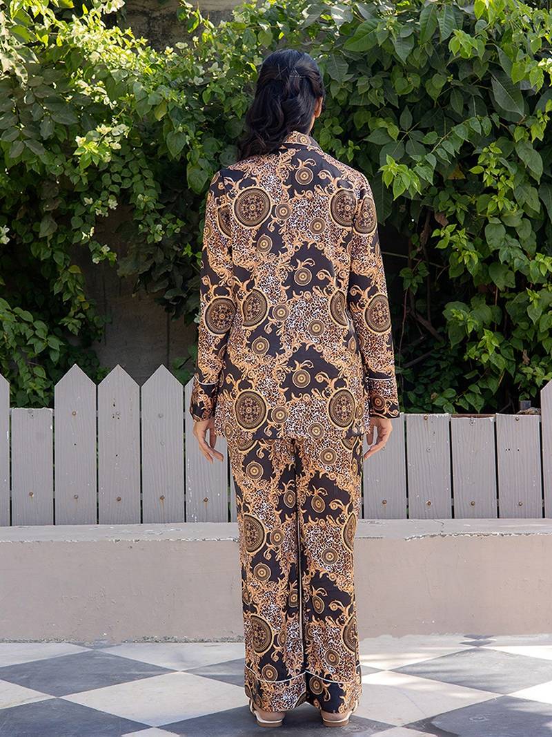 Black printed satin pant shirt