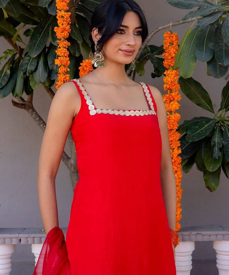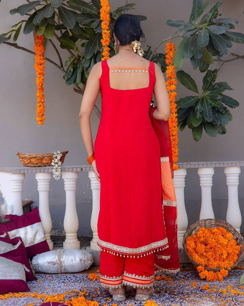 | Product Description | Ignite The Room In This Radiant Ruby Red Sleeveless Set. The Modern Square Neckline Meets Traditional Artistry With A Heavy Orange Thread Work And Gota Lattice Border. |