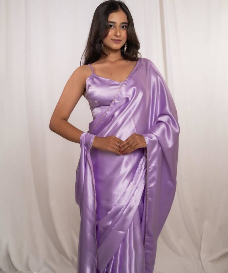 Product Name Lavender Cutdana Border Satin Embroidered Saree With Stitched Blouse