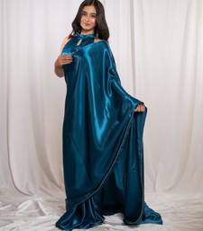 Teal blue cutdana border satin embroidered saree with stitched blouse