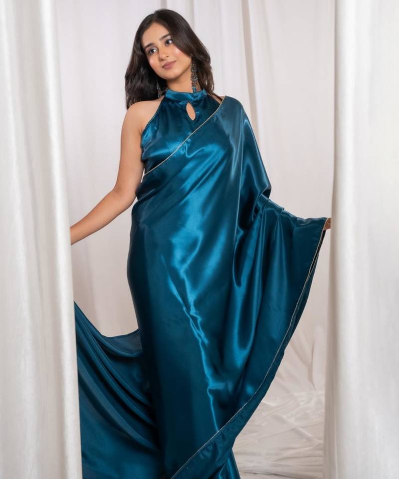 Product Name Teal Blue Cutdana Border Satin Embroidered Saree With Stitched Blouse