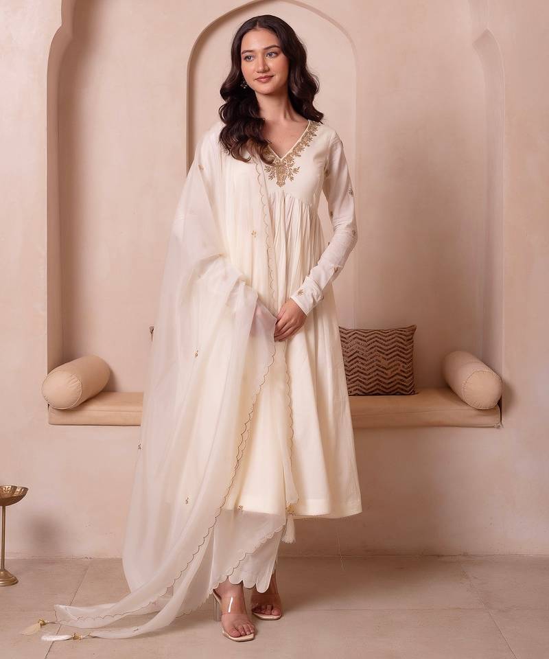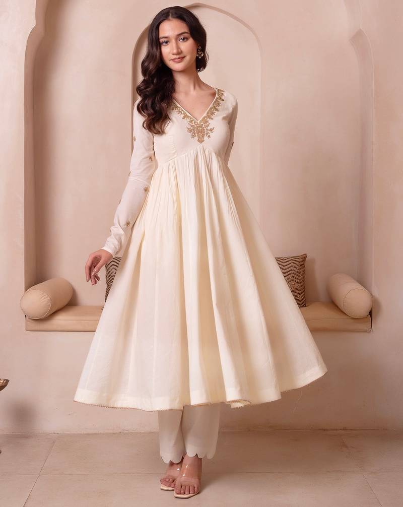 Product Name Cream White Handwork Cotton Anarkali Suit Set