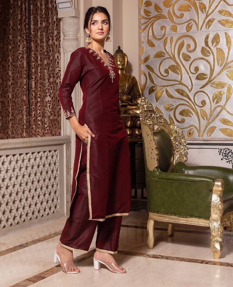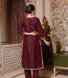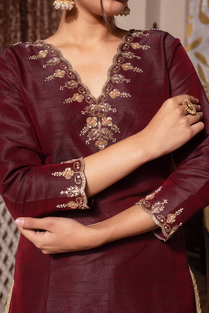 Dark maroon handwork pakistani silk kurta set stitched