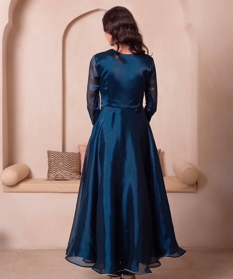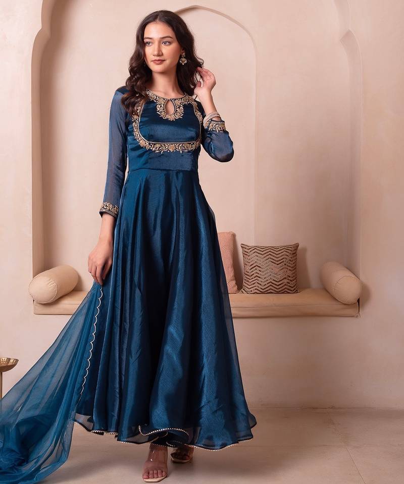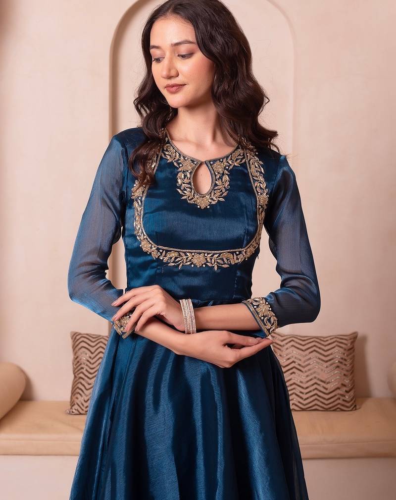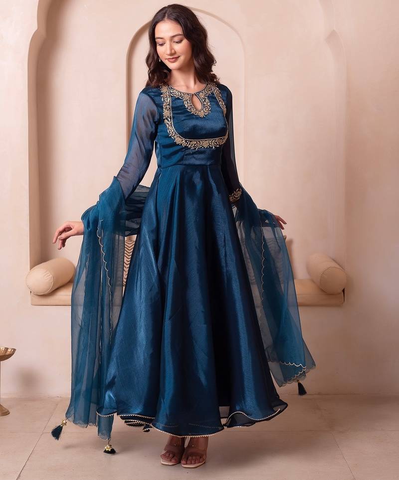 Teal blue organza handwork anarkali suit set stitched