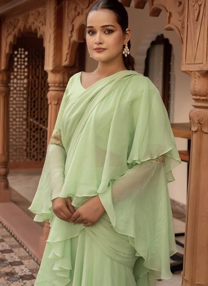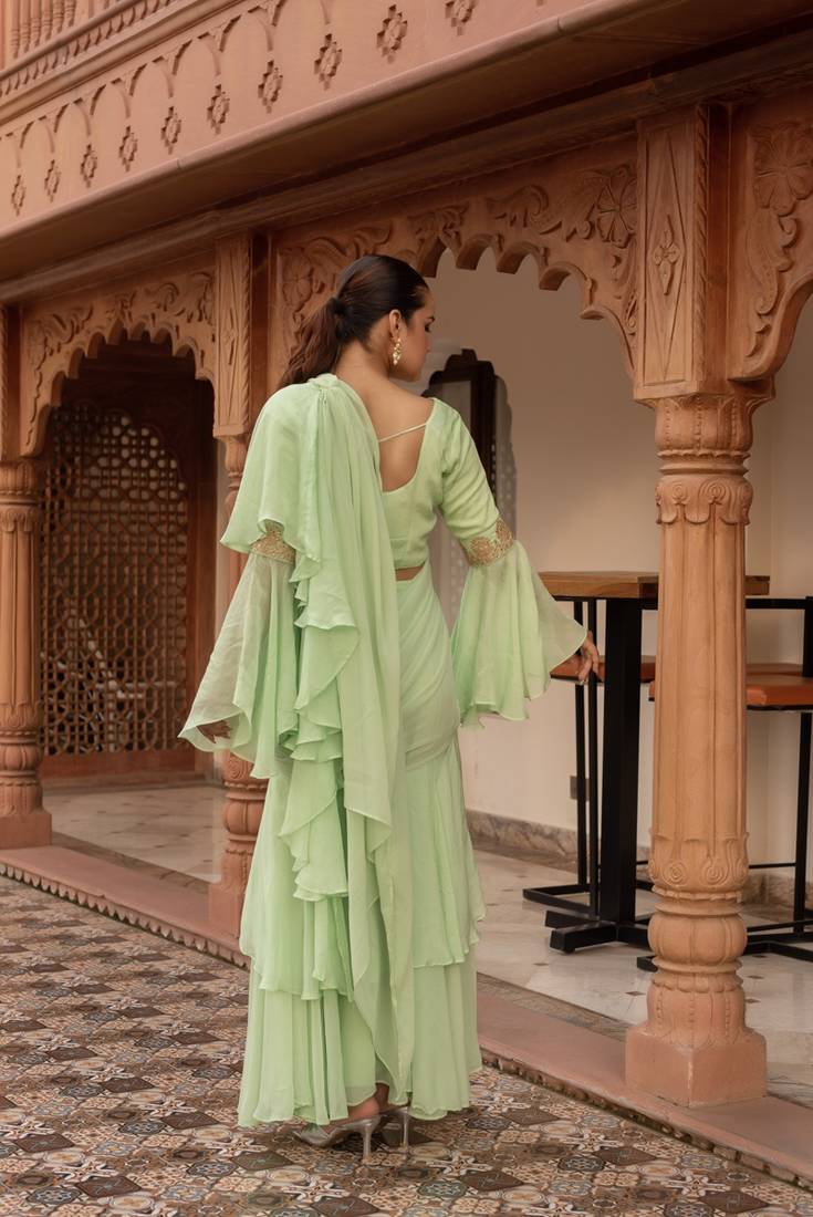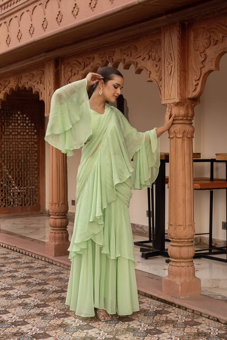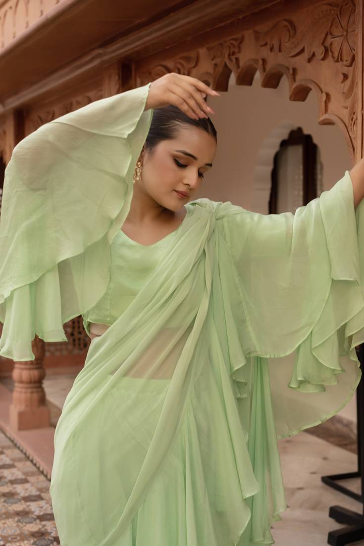 Elaichi organza georgette pre-draped saree with blouse