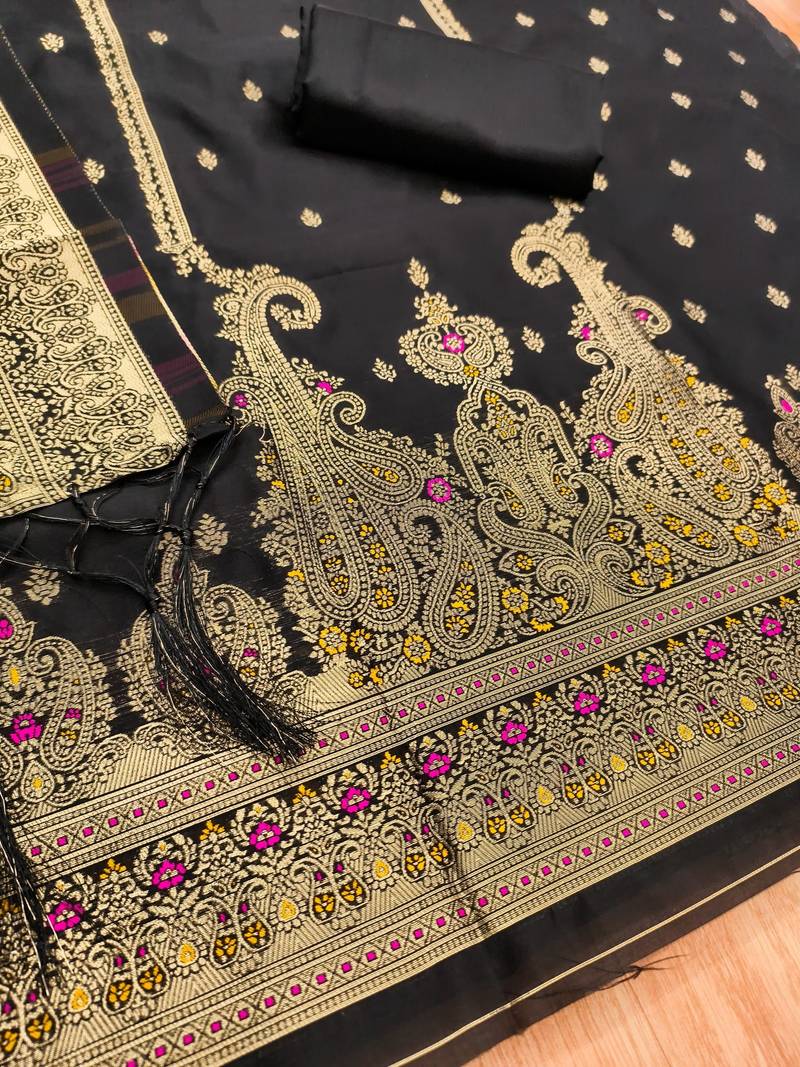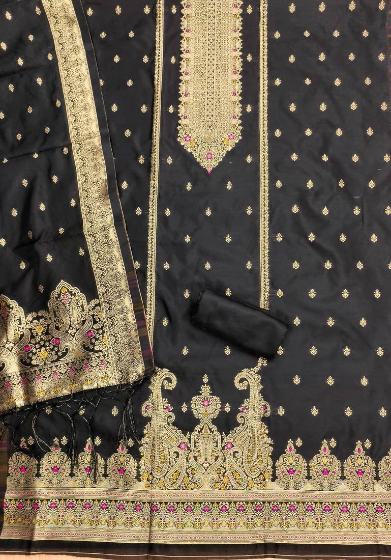 | Product Name | Black Soft Banarasi Silk Pure Zari Woven Design Dress Material | |