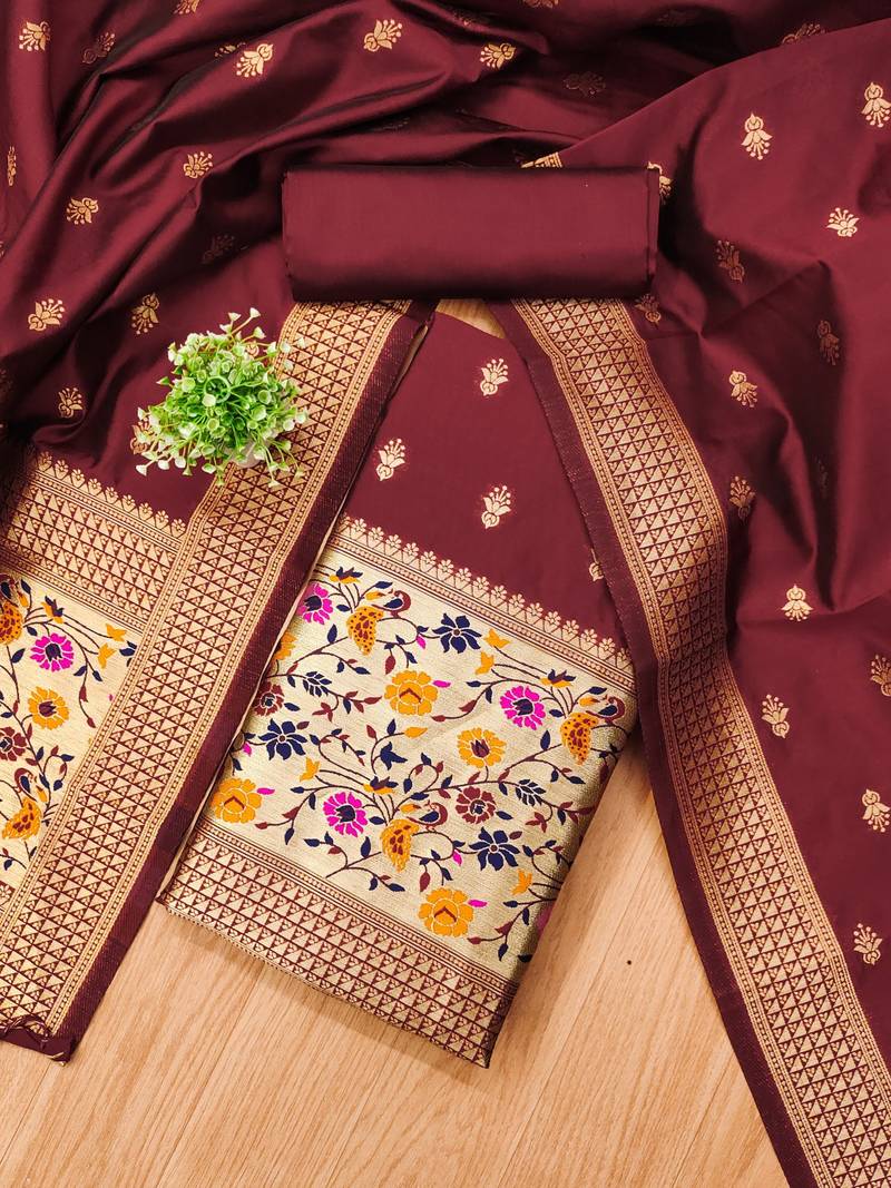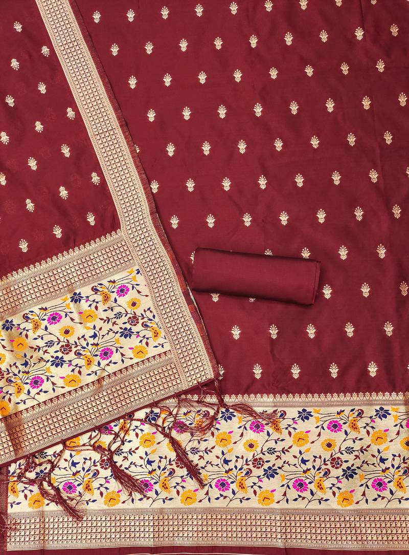 Maroon soft banarasi silk pure zari woven design dress material unstitched