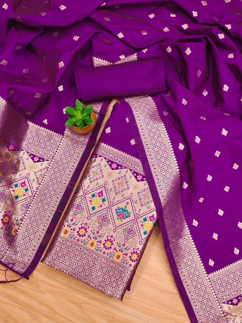 Purple soft banarasi silk pure zari woven design dress material unstitched