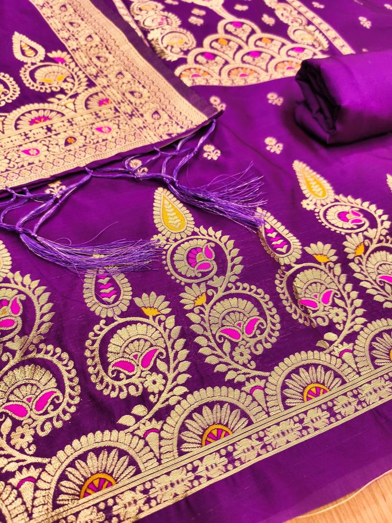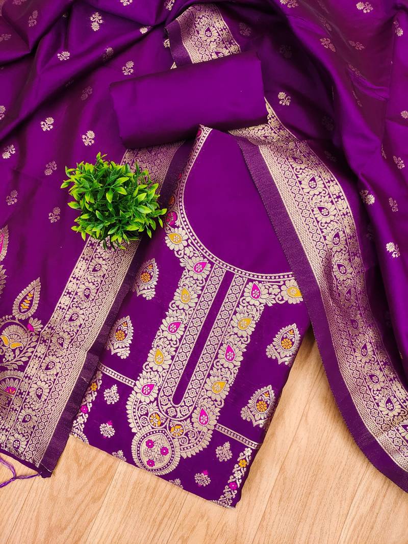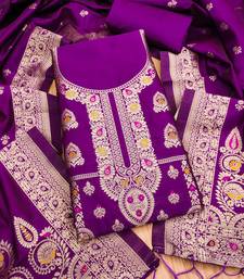 Purple soft banarasi silk pure zari woven design dress material unstitched