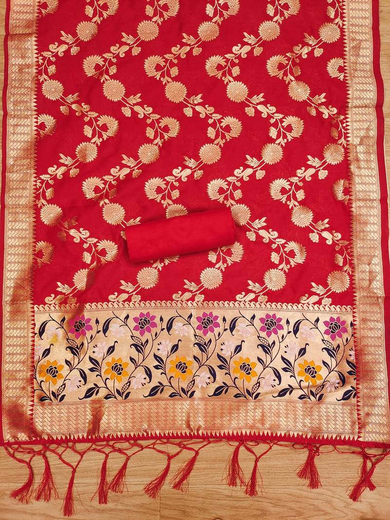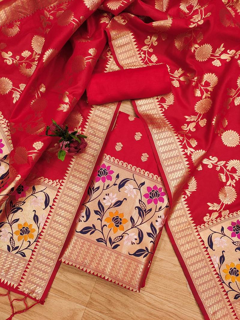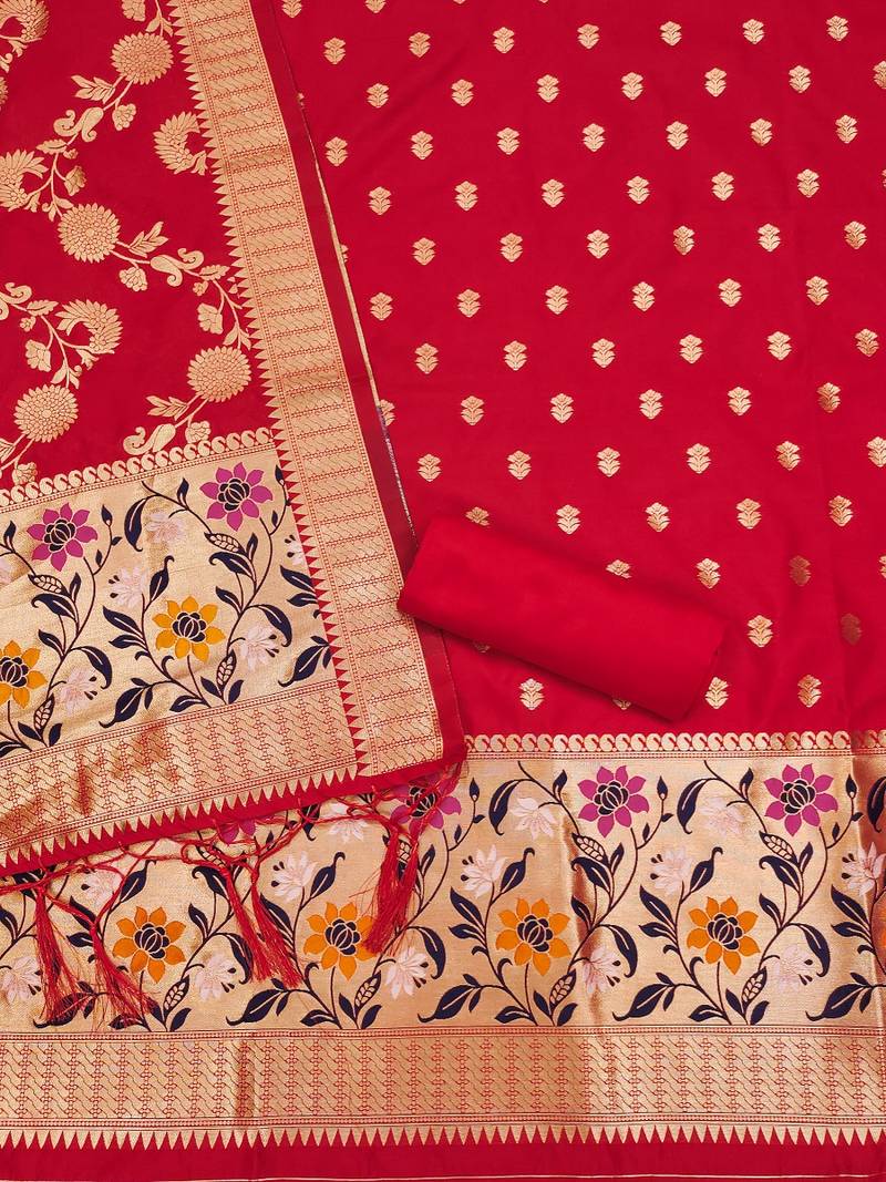 Red soft banarasi silk pure zari woven design dress material unstitched