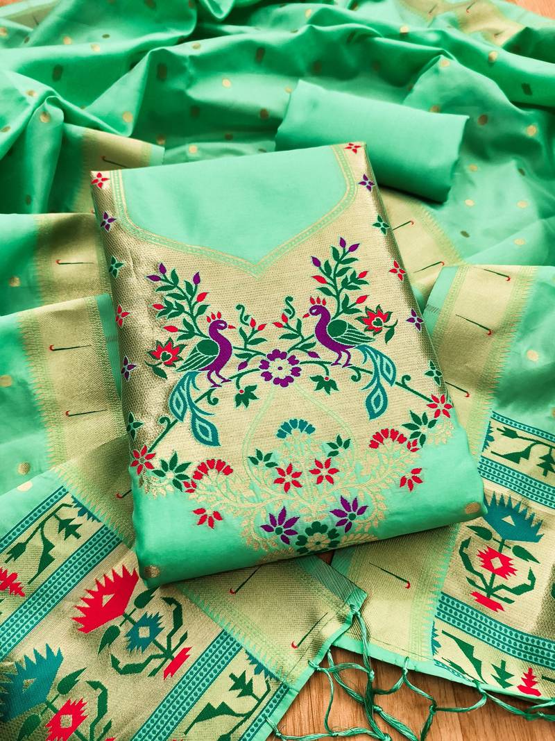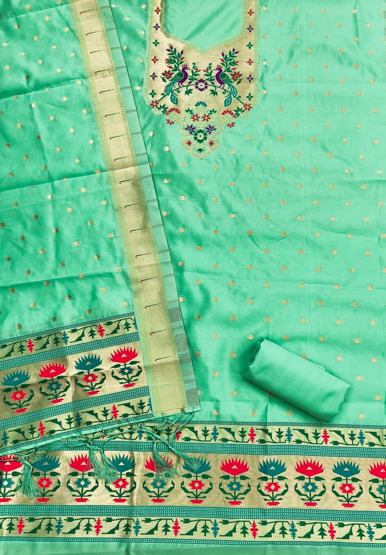 Sea green soft banarasi silk pure zari woven design dress material unstitched