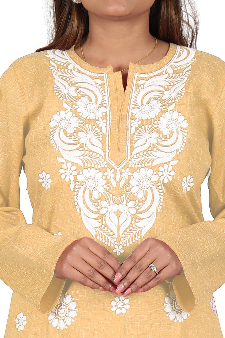 Lavangi women's lucknow chikan embroidery work khadi cotton kurti (fawn)