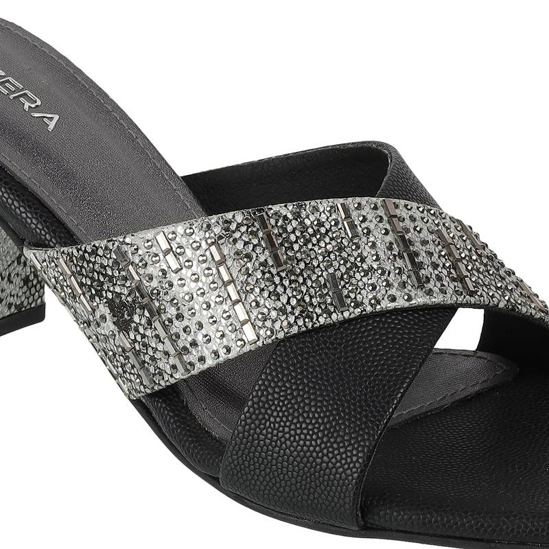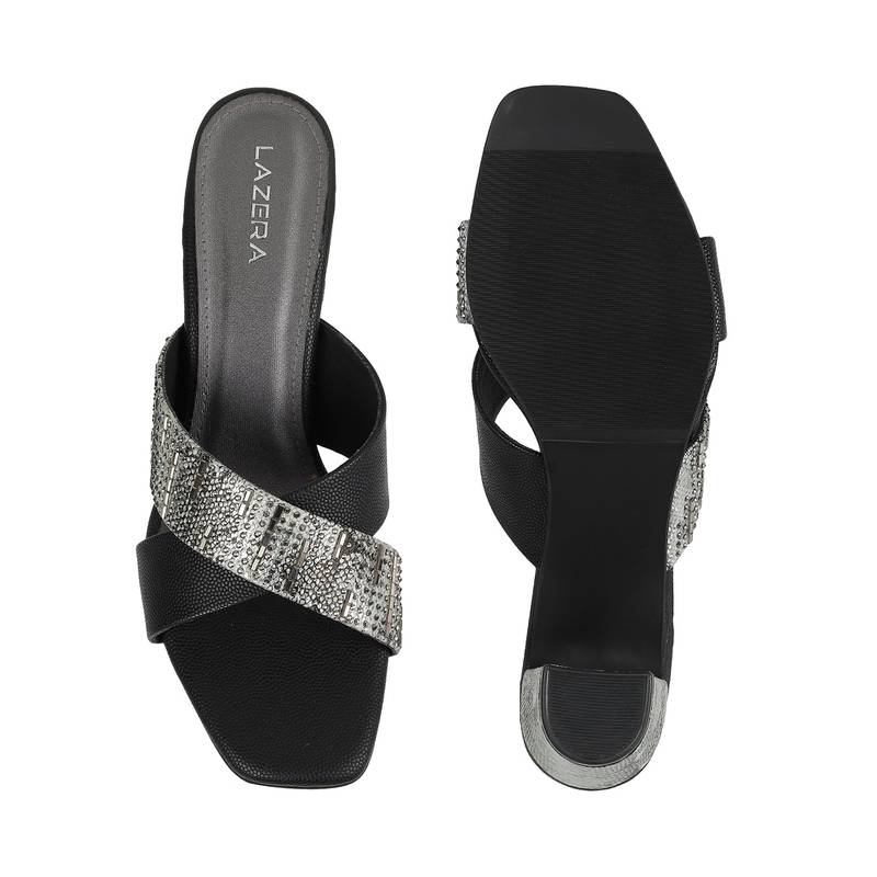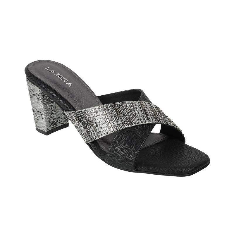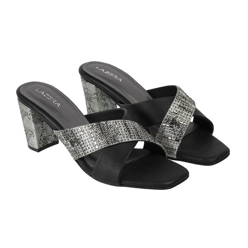 | Product Description | • Color: Black With Silver Embellishments Shoe Size: Available In Multiple Sizes (36–41) Footwear Material: Synthetic Upper With Embellished Strap, Cushioned Lining, Resin Sole Age Group: Adult (18–45 Yrs) Care Instructions: Wipe Gently With A Dry Cloth; Store In A Cool, Dry Place; Avoid Moisture And Harsh Chemicals Closure Type: Slip On Flat Shoe Style: Not Applicable Heel Height Type: Mid Heel (2.5–3.5 Inches Approx.) Heel Shoe Type: Block Heel Occasion Style: Partywear, Cocktail, Wedding, Festive, Evening Outings Sandal Style: Cross Strap Heeled Sandal Shoe Features: Embellished Strap, Snake Texture Heel, Cushioned Footbed, Anti Slip Sole Shoe Fit: Regular Fit Slipper Style: Not Applicable Target Gender: Women Toe Style: Open Toe, Square Toe Description: Add A Bold Edge To Your Party Wardrobe With These Lazera Black Block Heel Sandals Featuring Cross Straps Detailed With Sparkling Embellishments