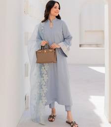 Stylish Neck With Dense Sequin And Thread Work. Premium Organza Silk Dupatta Features Delicate Floral Embroidery And Scalloped Borders. Elegant Sequin Accented Cuffs Provide A Polished Pakistani Kurta Set Finish.