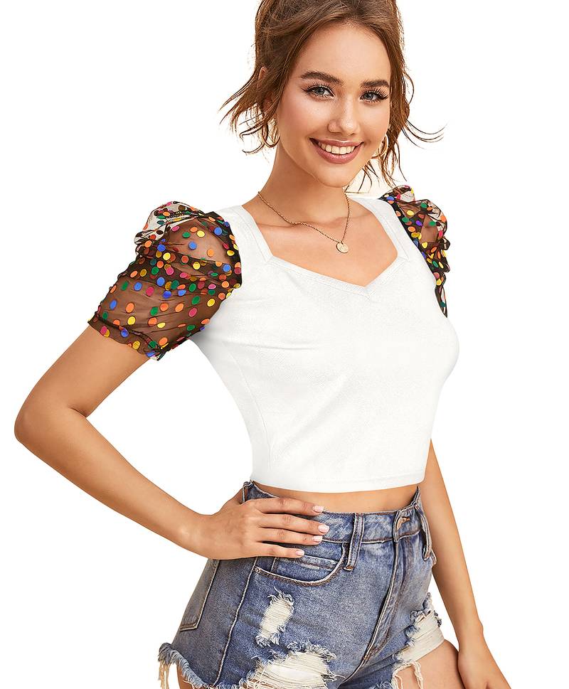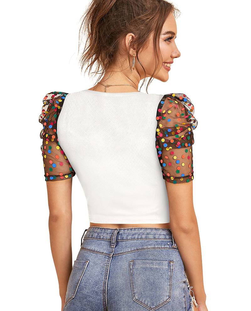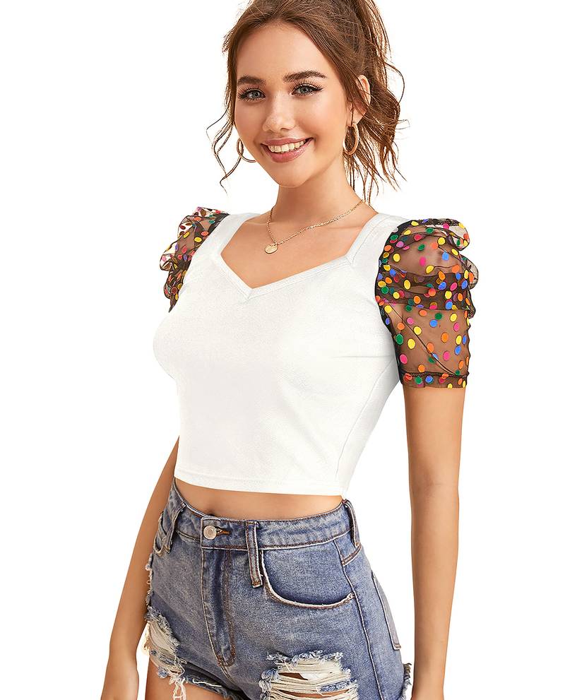 | Product Name | White Dot Printed Puff Sleeve Crop Top For Women Aesthetic V Neck Designer Top | |