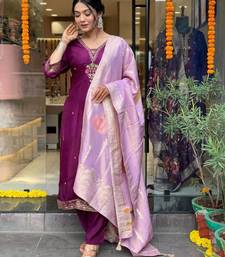 Wine chanderi silk sequin v-neck kurta set with royal jacquard dupatta