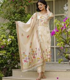 Women's cream viscose silk sequin & stone embroidered kurta pant set with printed silk dupatta