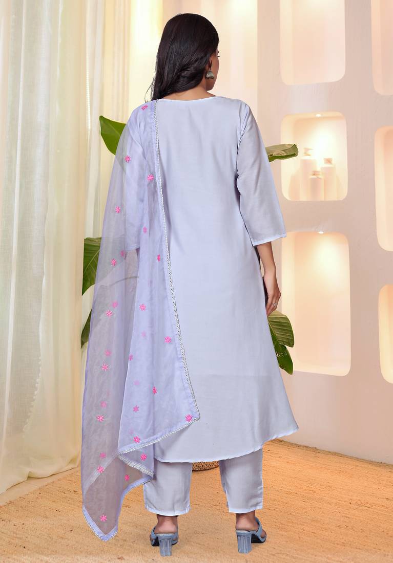 Women's Lavender Silk Sequin Embroidered Kurta Pant Set With Organza Dupatta