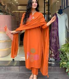 Women's rayon silk embroidered orange kurta pant set with chanderi dupatta stitched