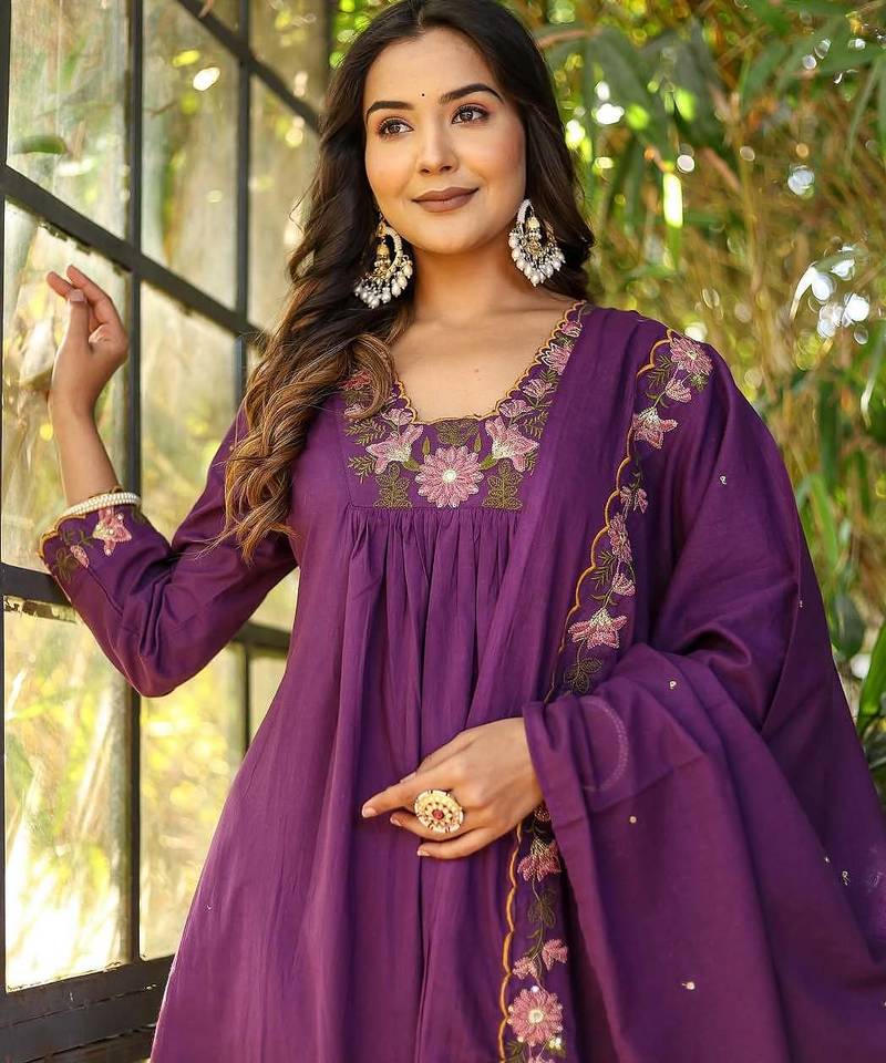 | Embellish | Premium Rayon Silk Purple Kurta Pant Set With Elegant V Neck And Floral Embroidery. Soft, Breathable Fit With Embroidered Chanderi Dupatta, Perfect For Festive, Wedding, And Party Wear. | |