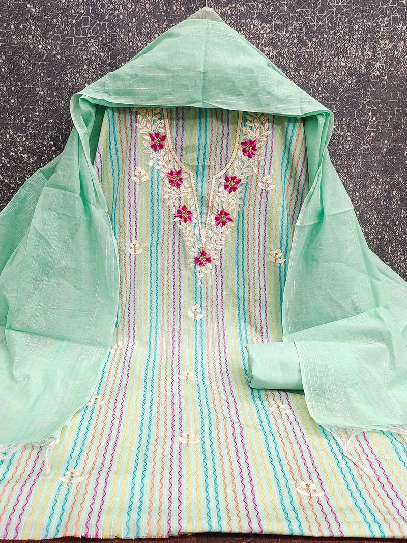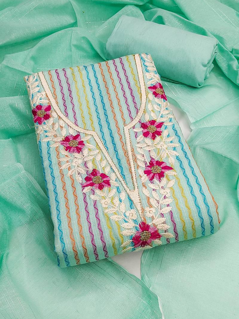 Product Description | This Elegant Dress Material Set Features A Refreshing Pastel Green Base, Perfect For A Graceful And Soothing Look. The Kurta Showcases Multicolored Wavy Stripes In Blue, Purple, Yellow, And Orange, Enhanced With Intricate Floral Embroidery Around The Neckline. The Embroidery Includes White Leafy Patterns And Striking Magenta Flowers With Golden Centers, Adding A Vibrant Contrast. A Stylized V Slit Neckline Gives The Outfit A Modern Touch. The Set Includes A Matching Pastel Green Dupatta And Bottom Fabric With Subtle Silver Threadwork, Lending A Hint Of Shimmer. Ideal For Casual Wear Or Semi Formal Occasions, This Set Combines Comfort With Timeless Elegance. |
