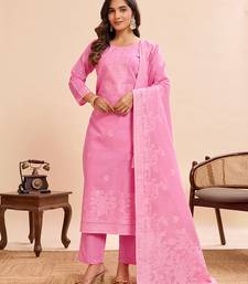Elegant pink pure cotton jacquard kurta set with dupatta