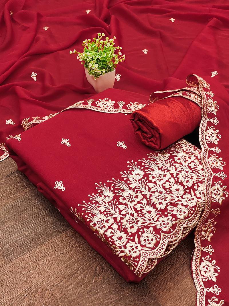 Product Description | This Stunning Embroidered Suit Set Features Beautiful Floral Threadwork On The Kurta Hem And An Elegantly Scalloped Dupatta Border, Giving A Rich And Festive Appeal. The Unstitched Fabric Allows Complete Customization For A Perfect Fit. Pair With Statement Jewelry And Matching Footwear To Create A Sophisticated Ethnic Ensemble For Any Celebration. |